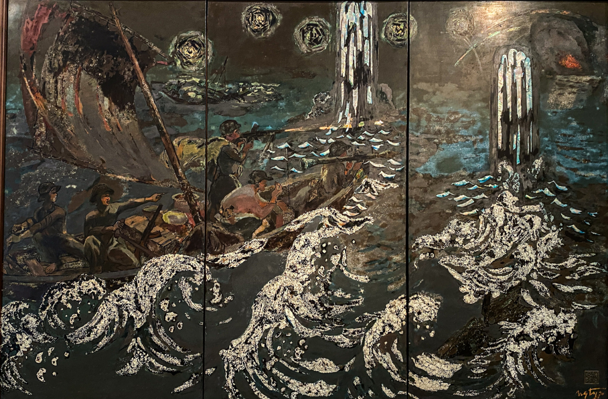 Desciption: Bức tranh mô tả cảnh đoàn quân đi giữa, hai bên là hình tượng bà má miền Nam, cô gái Ngã ba Đồng Lộc và những em nhỏ thể hiện khát vọng chiến thắng, xây dựng tương lai đất nước.