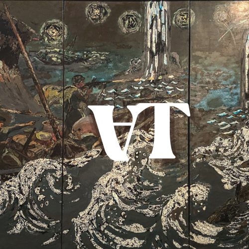 Desciption: Bức tranh mô tả cảnh đoàn quân đi giữa, hai bên là hình tượng bà má miền Nam, cô gái Ngã ba Đồng Lộc và những em nhỏ thể hiện khát vọng chiến thắng, xây dựng tương lai đất nước.